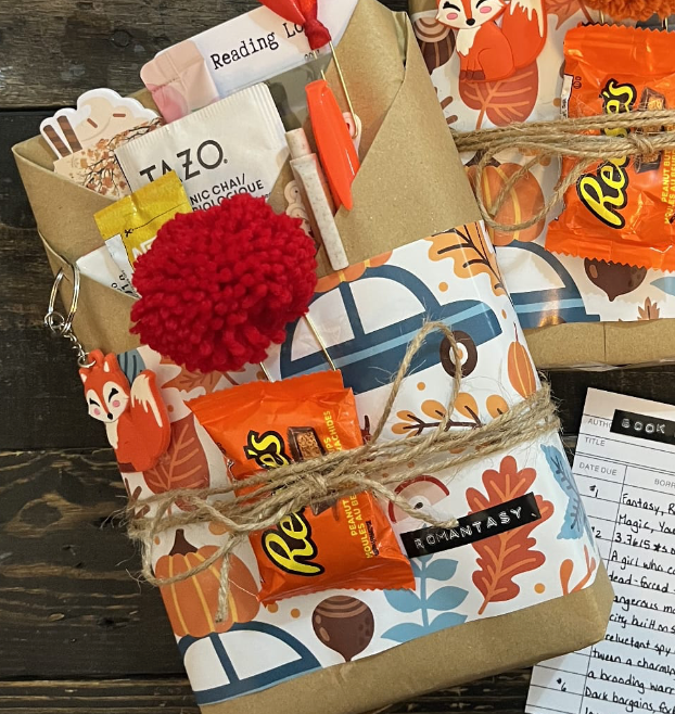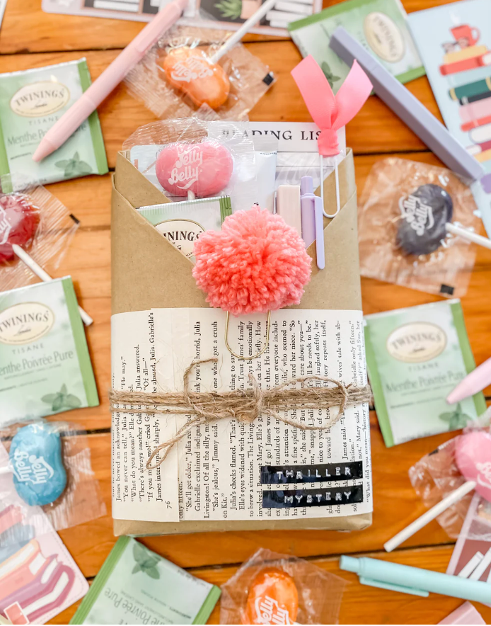 New and pre-loved books wrapped with all sorts of reading goodies - bookmark, sticker, candy, pen, drink mix, key chain and more.