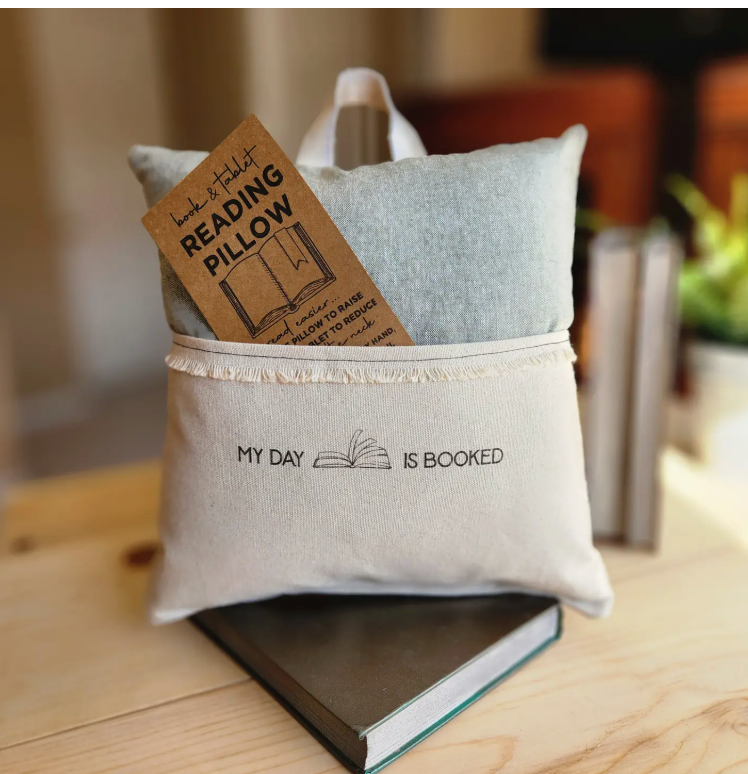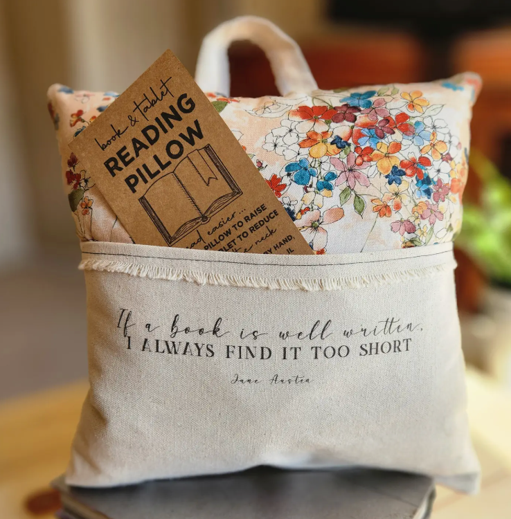Not your typical throw... the perfect gift for bookworms and tablet scrollers. *Featuring a durable canvas back, pocket, and handle, then layered with a fun pattern, this lightweight 14x14 pillow is a great companion for reading
