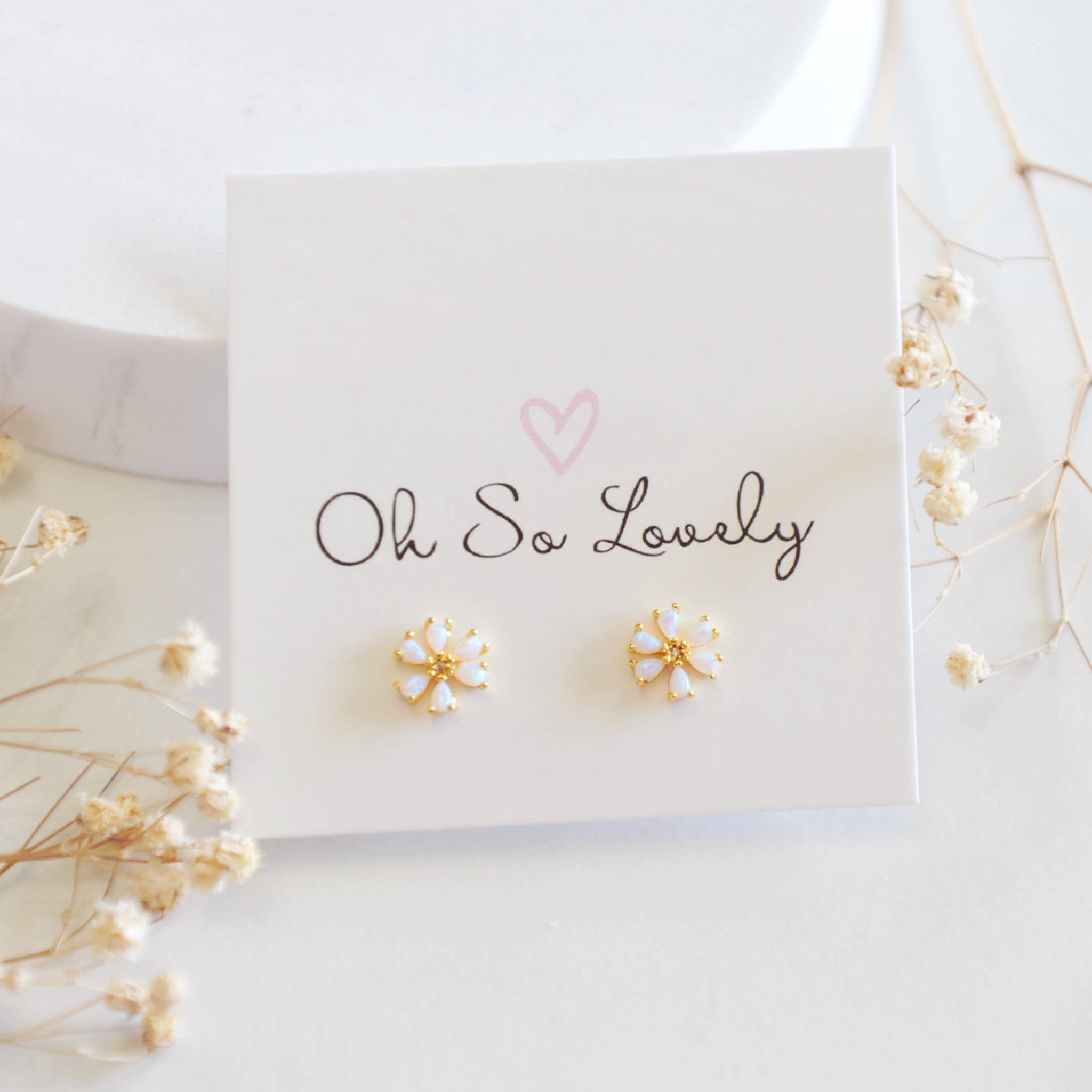 Opal flower daisy stud earrings with 925 posts. 14k gold plated 8.5mm Cubic zirconia