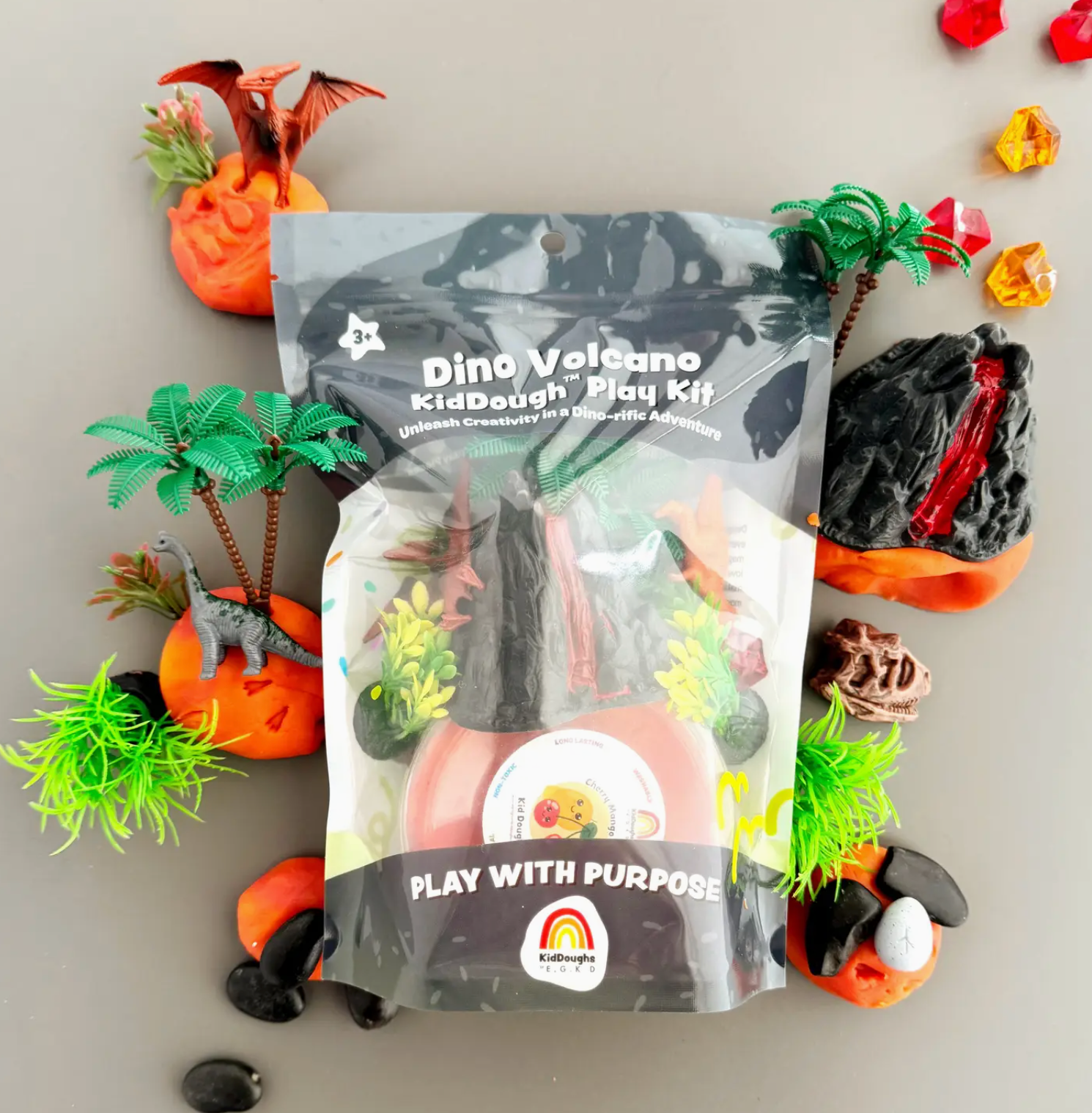 Includes: 5 oz Green (Watersmellon) KidDough, Resin Dinosaur Figurine, 2 Palm Trees, Dino Egg, Prehistoric Plant and Eggshell Fimos