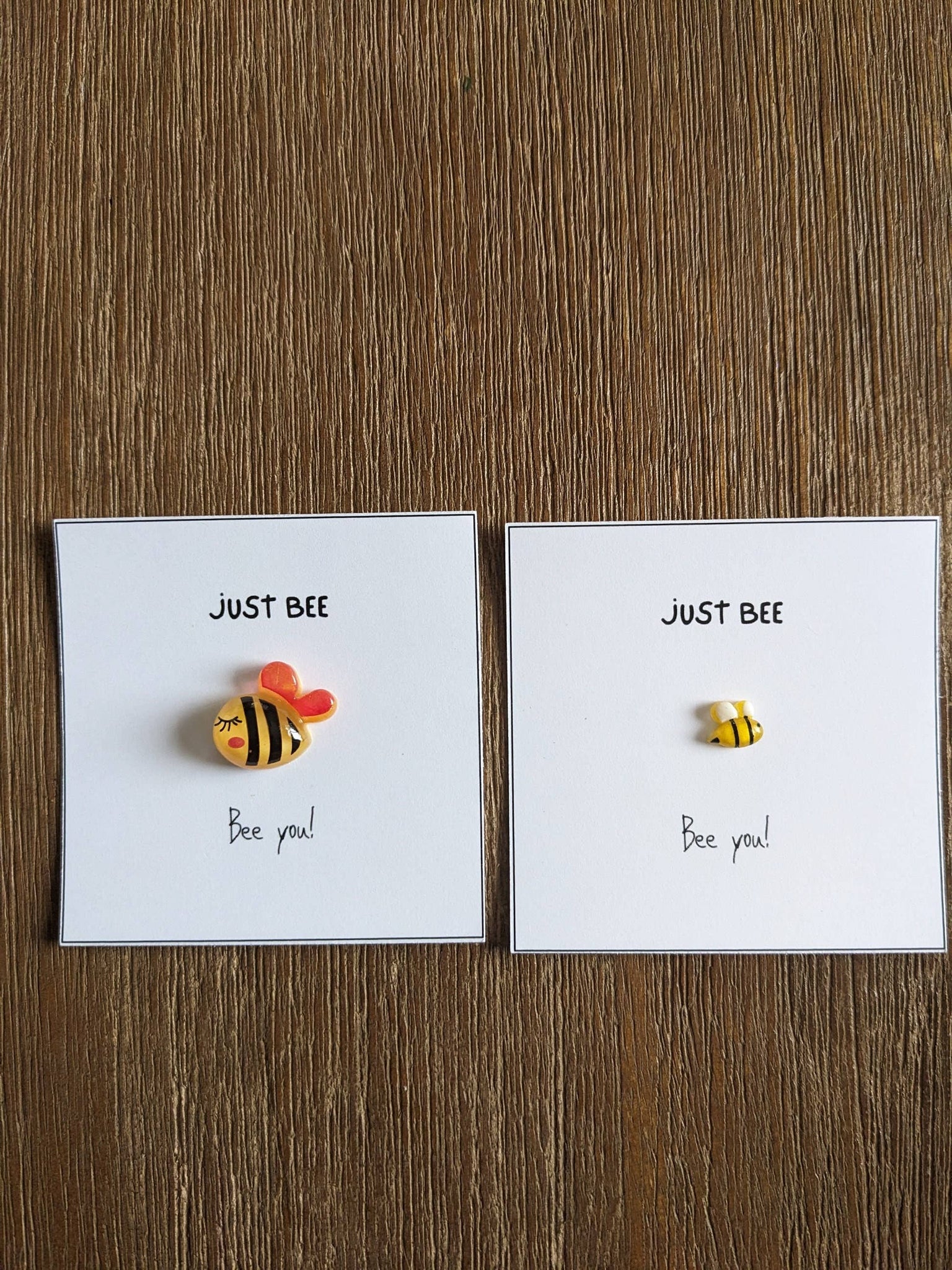 Celebrate individuality with our "Just Bee, Be You!" card, featuring a charming bee figurine. Choose between a bold big bee or a small and dainty bee to match your style. Add a handwritten note on a rectangular white cardstock for a personal touch.