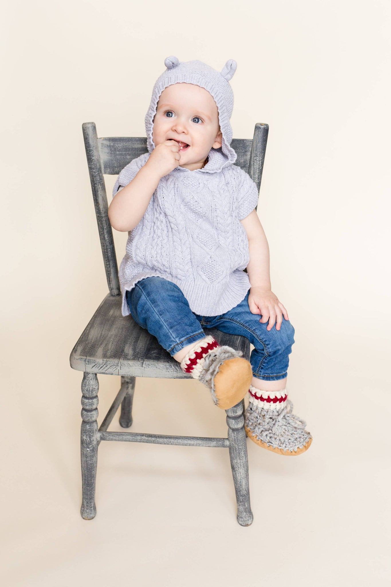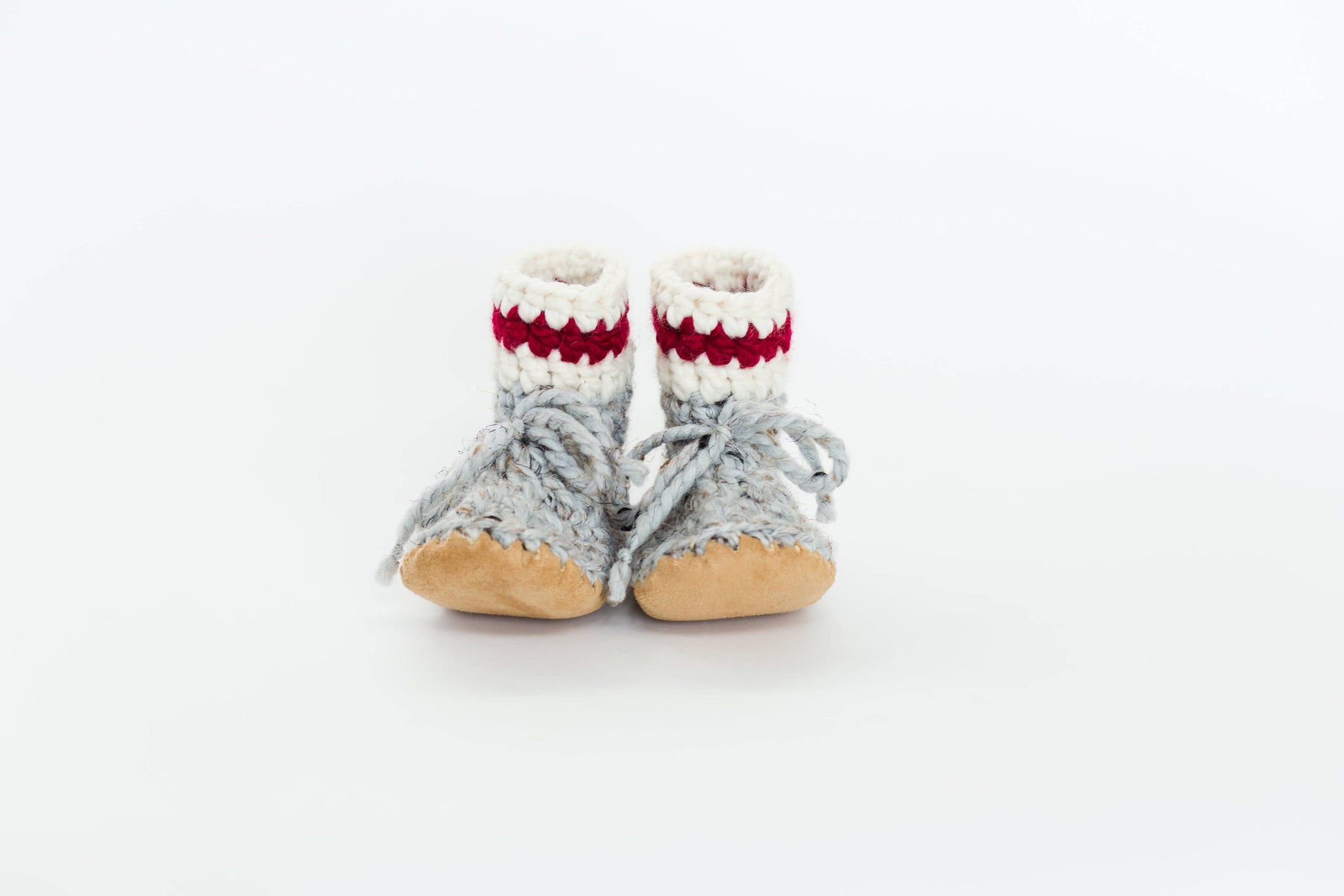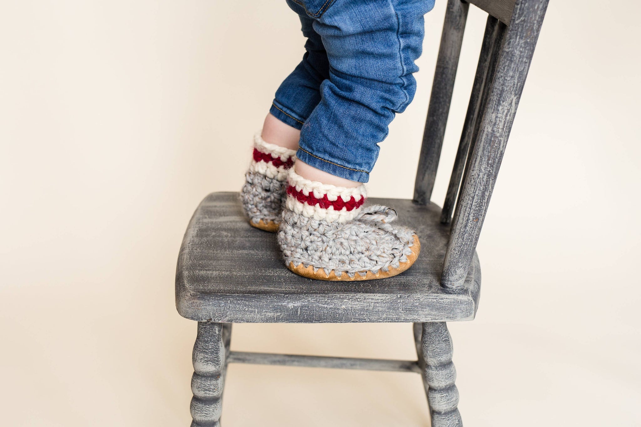 Huddy Buddies are made with a durable and washable eco-suede sole which is lined with a plush faux-fur for comfort and warmth. The hand crocheted uppers are made with soft 20% wool blend yarn that is soft and not itchy. These soft sole slippers will easily slip-on any little foot no matter how chubby or narrow... and STAY PUT with their functional laces. Be sure you tighten those laces and you will not arrive home to find one slipper missing and cold little toes. The soft soles not only allow these slippers to grow with your baby over many sizes but they are also weather-resistant and great for indoor and outdoor use. Mind you the crochet portion of the slipper is not very fond of puddles. If you do get them dirty simply throw in the washing machine and then let them air dry. Pediatricians recommend soft soles for littles up to two years to allow for healthy footdevelopment and to promote balance and coordination to early walkers. The next best thing to barefoot are Huddy Buddies.