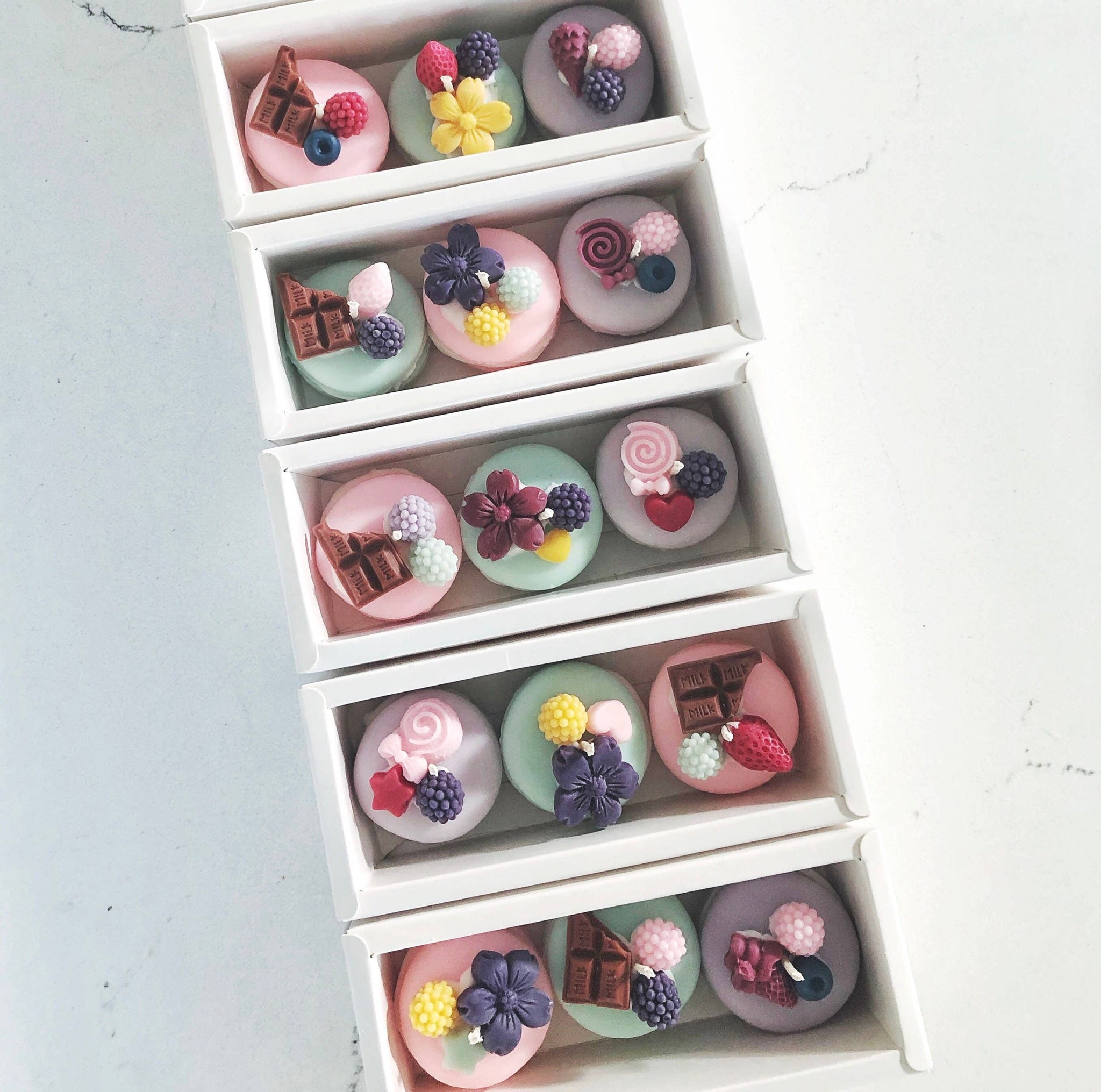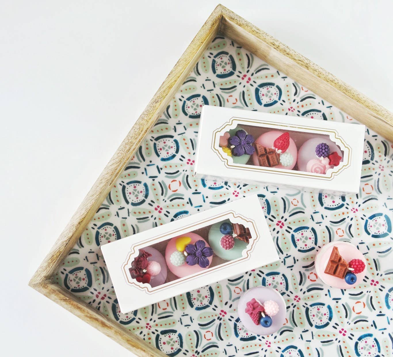 Three macaron candles included in each set. Our macaron dessert soy candles are meticulously detailed. They are adorable to look at and smell heavenly also. Each color comes in a different scent. These macarons can also be used as wax melts with the wick removed.