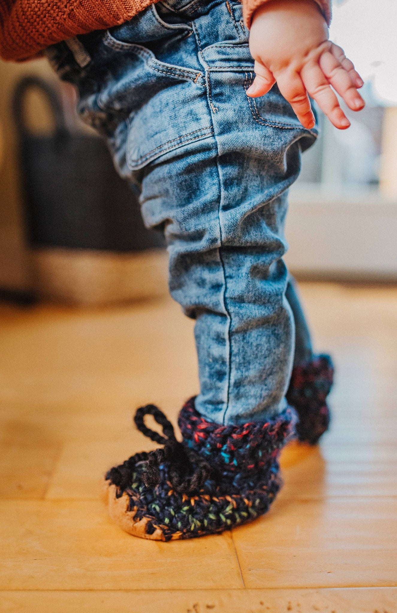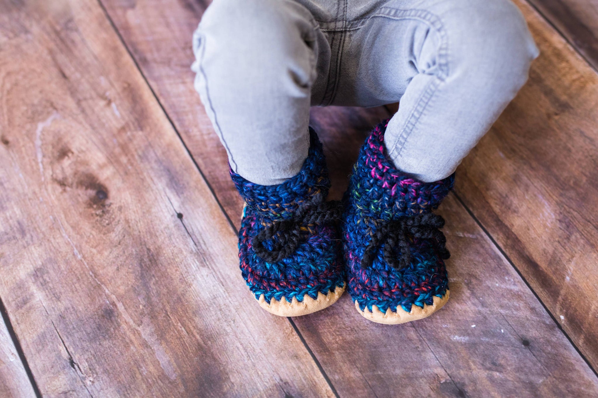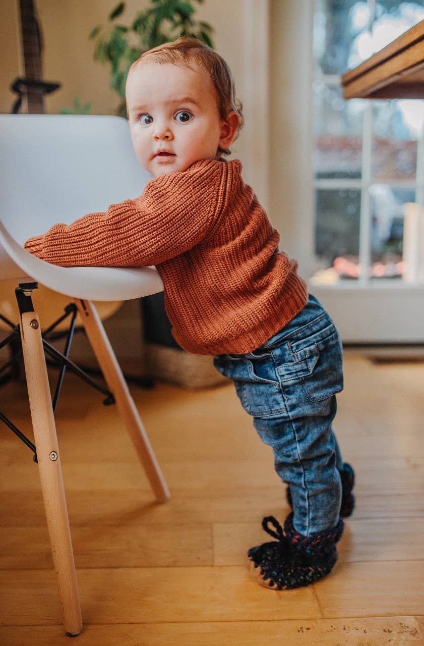 Huddy Buddies are made with a durable and washable eco-suede sole which is lined with a plush faux-fur for comfort and warmth. The hand crocheted uppers are made with soft 20% wool blend yarn that is soft and not itchy. These soft sole slippers will easily slip-on any little foot no matter how chubby or narrow... and STAY PUT with their functional laces. Be sure you tighten those laces and you will not arrive home to find one slipper missing and cold little toes. The soft soles not only allow these slippers to grow with your baby over many sizes but they are also weather-resistant and great for indoor and outdoor use. Mind you the crochet portion of the slipper is not very fond of puddles. If you do get them dirty simply throw in the washing machine and then let them air dry. Pediatricians recommend soft soles for littles up to two years to allow for healthy footdevelopment and to promote balance and coordination to early walkers. The next best thing to barefoot are Huddy Buddies.